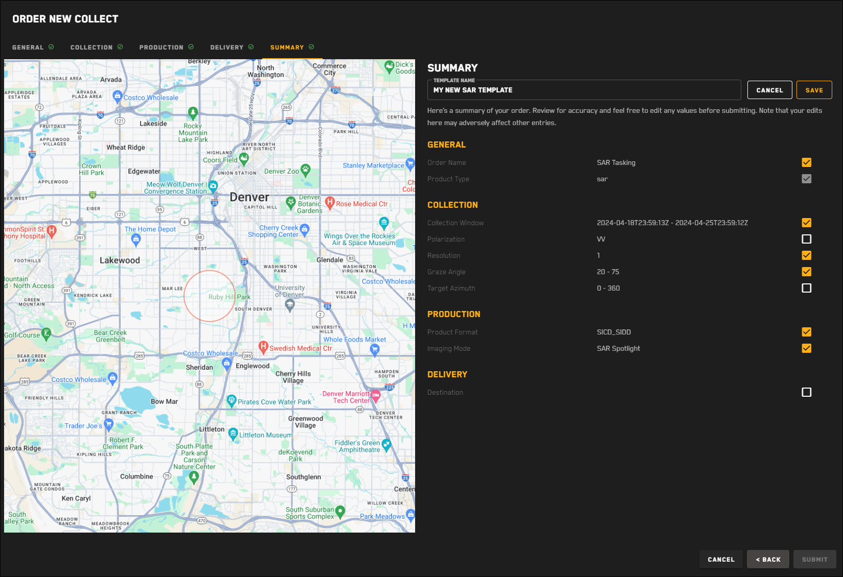 If you want to reuse the parameters from your tasking request, you can quickly create a tasking template from the Summary page of the tasking wizard.
