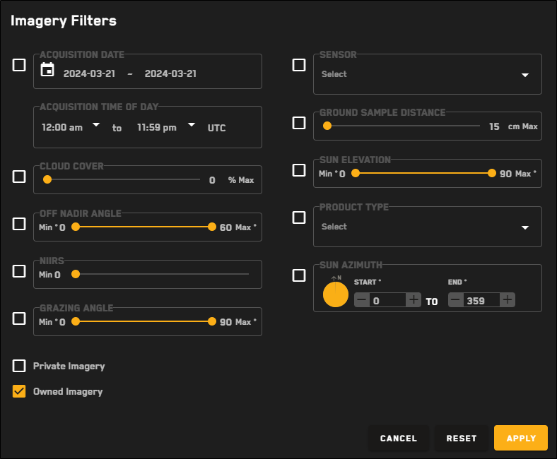 5. (Optional but selected by default; online imagery only) If you only want to search for owned imagery, select the checkbox next to Owned Imagery.