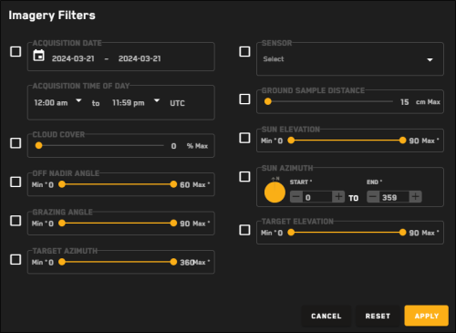 Filters allow you to narrow down the imagery that appears in the Imagery panel, so you will see the imagery that is most relevant to you.