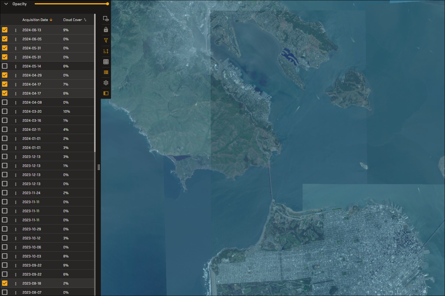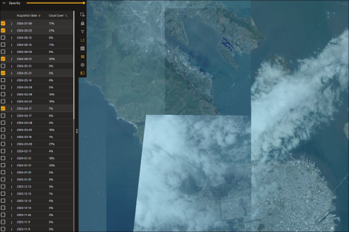 By default, the auto-selected imagery over San Francisco, California has relatively high cloud-cover, so the viewport is obstructed in spots.