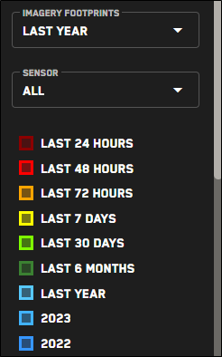 • Imagery Footprints (Default: None) The time frame of the imagery acquisition date (e.g., a specific year, last 24 hours, last 7 days, last year, none)
