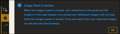 The first time you use Rapid Access, when you perform an action that locks the Imagery panel, a message appears with more information about using the Imagery panel in locked mode. To close the message, select OK.