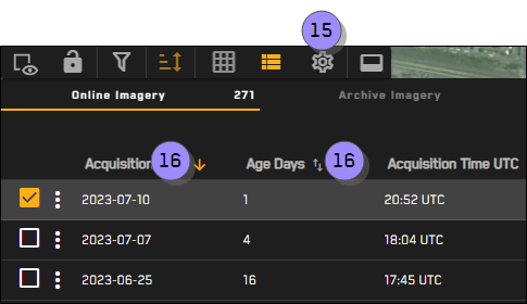 1 | Select the imagery catalog (e.g., online, archive) you want to view in the Imagery panel. The catalog name and total number of available images display on each tab. | |||||||||