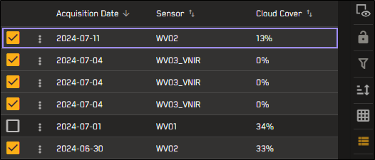 By default, Rapid Access automatically selects imagery that provides the best coverage of an area. If you want to remove this imagery from the viewport, you can clear the automatic selections from the Imagery panel using the Deselect All option. You can also use this option if you want to quickly clear all of your selections from the Imagery panel at any time.