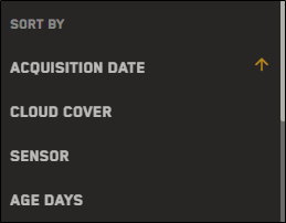 Sortable and filterable metadata fields are different when you are viewing archive imagery than when you are viewing online imagery. When viewing archive imagery, sorting is limited to Acquisition Date, Cloud Cover, and Off Nadir Angle (both in the Sort By menu and when using sort arrows in the Imagery panel). This is a limitation of the Archive Discovery API. See Metadata Differences When Sorting and Filtering Archive and Online Imagery.