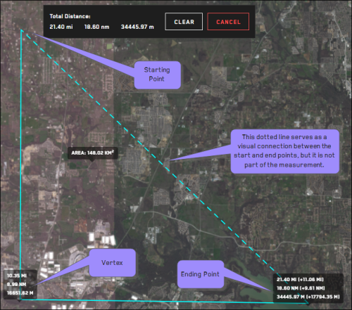 If you draw more than one segment, additional callouts indicate the total distance between each segment, as well as the distance added by each additional segment (+mi, +nm, +m). The total distances also display in a box at the top of the viewport.