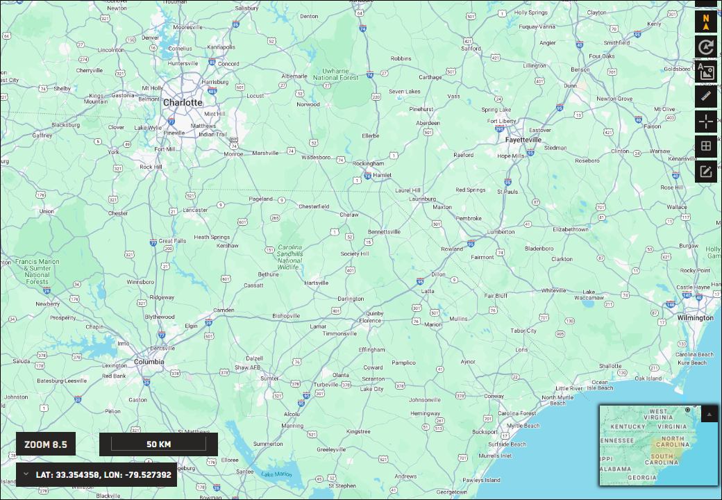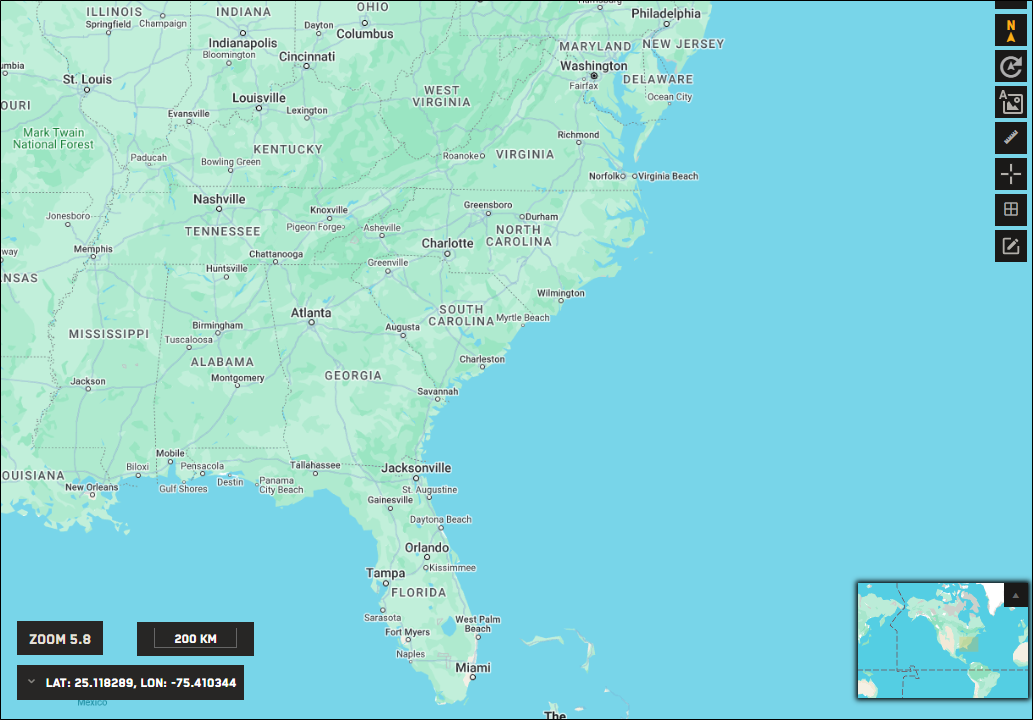In this example, the viewport shows a portion of the United States, but the minimap shows most of the globe.