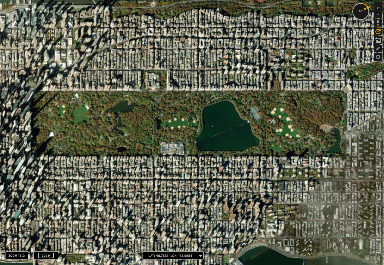 By default, an image of Central Park in New York City shows the park on an angle. By rotating the viewport to 61°, you can fit more of the park in the viewport and view it at a "grid-like" angle.
