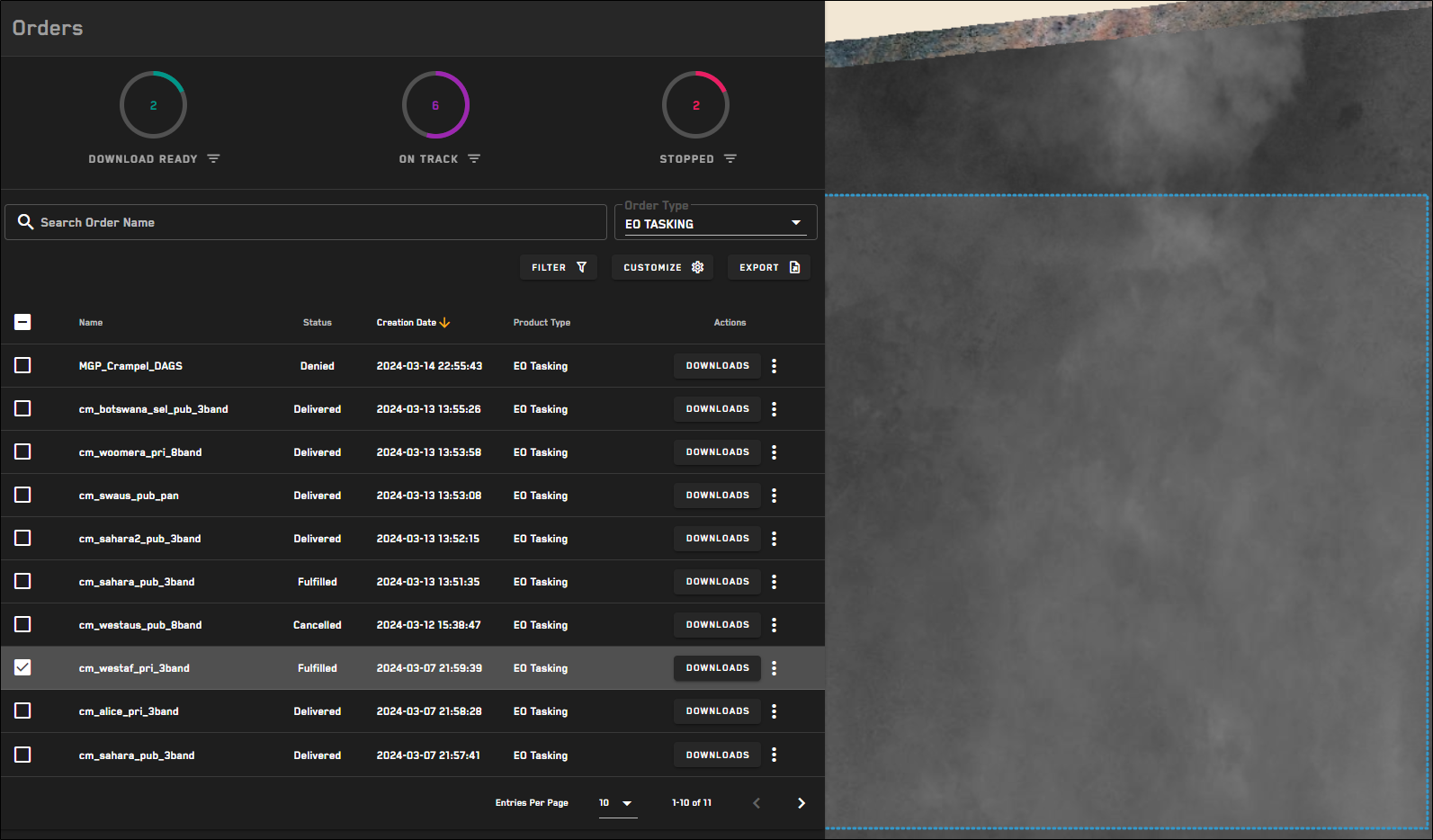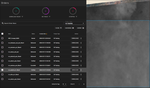 The dashboard at the top of the Orders panel visualizes how many orders are ready to download, are on track (e.g., in production, delivering), or are stopped (e.g., canceled, reorder required).